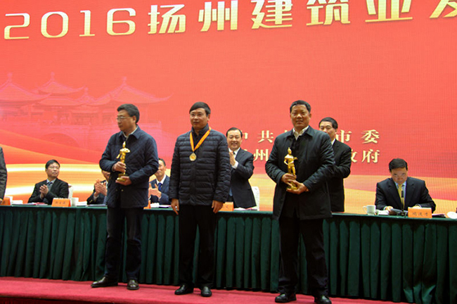 會(huì)議由聞道才副市長(zhǎng)主持,與會(huì)人員首先觀看了“十二五”揚(yáng)州建筑業(yè)發(fā)展專題片,聽取了朱民陽(yáng)市長(zhǎng)所做的工作報(bào)告。然后市政府對(duì)2015年全市建筑業(yè)目標(biāo)管理獎(jiǎng)獲獎(jiǎng)單位和全市建筑業(yè)先進(jìn)企業(yè)、先進(jìn)個(gè)人進(jìn)行了表彰。建工控股公司獲得唯一的2015年市政府建筑業(yè)目標(biāo)管理一等獎(jiǎng),位列各縣(市)區(qū)之上,市委書記謝正義親自向陸金龍董事長(zhǎng)頒獎(jiǎng)。2015年全市僅有的兩項(xiàng)魯班獎(jiǎng)工程均由江蘇華建創(chuàng)造,宗有農(nóng)總經(jīng)理、吳士茂主席上臺(tái)領(lǐng)獎(jiǎng)。此外,江蘇華建還有4名員工分別被市政府表彰為優(yōu)秀建造師、優(yōu)秀班組長(zhǎng)。
