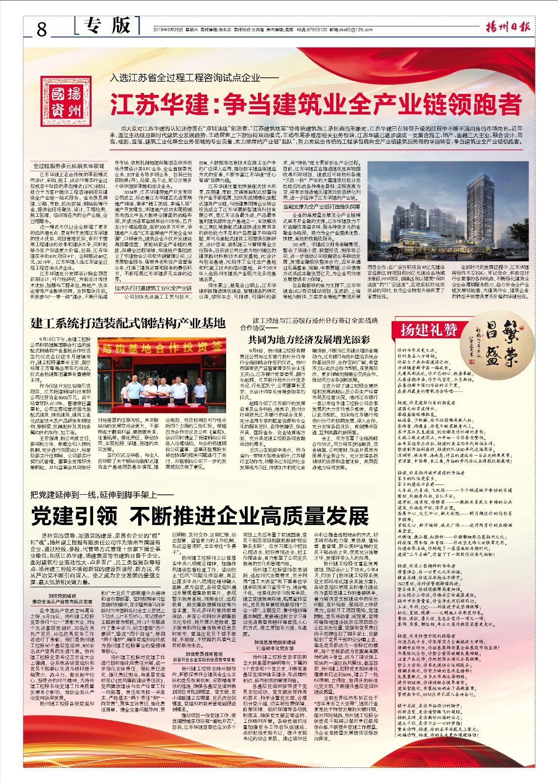 為了充分展示新中國成立70年來特別是黨的十八大以來建工控股改革發(fā)展所取得的歷史性成就,公司推出一期《揚(yáng)州日報》國慶專版,并對公司網(wǎng)站進(jìn)行了全面改版,更加符合當(dāng)下信息宣傳需要。系統(tǒng)企業(yè)江蘇華建、揚(yáng)建集團(tuán)參加由市政府舉辦的2019運(yùn)河文化嘉年華活動,用精心裝飾的花船點(diǎn)亮了千年運(yùn)河的獨(dú)特風(fēng)姿。江蘇華建同時聯(lián)合揚(yáng)州廣電推出了慶祝新中國成立70周年特別策劃——《愿以此身長報國》,展現(xiàn)了一個地方國企的初心和擔(dān)當(dāng)。