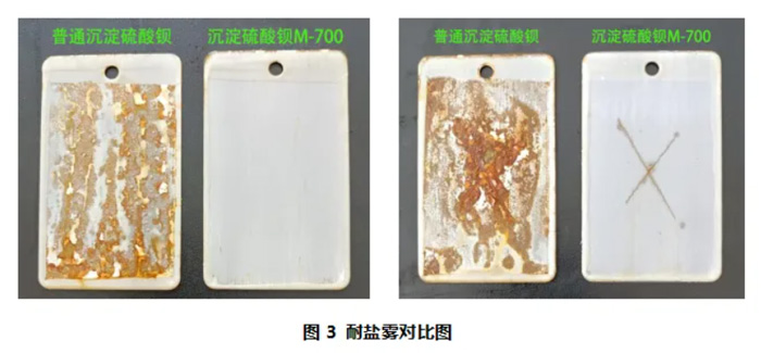 實驗測試結果如表3所示。從以上結果可看出,添加我司沉淀硫酸鋇M-700的漆膜光澤度明顯比添加普通沉淀硫酸鋇的高,且耐沖擊性、柔韌性均高出一個等級。分散性與潤濕流平性方面,我司沉淀硫酸鋇M-700不但好分散,還具有一定的潤濕助磨功效,可有效提高漆膜的流平性。3.2 耐鹽霧性測試
