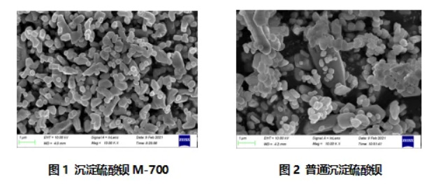 表1是本報告研究的沉淀硫酸鋇M-700與普通沉淀硫酸鋇的物性對比表。另外,從圖1、圖2可看到沉淀硫酸鋇M-700與普通沉淀硫酸鋇的電鏡圖差異。